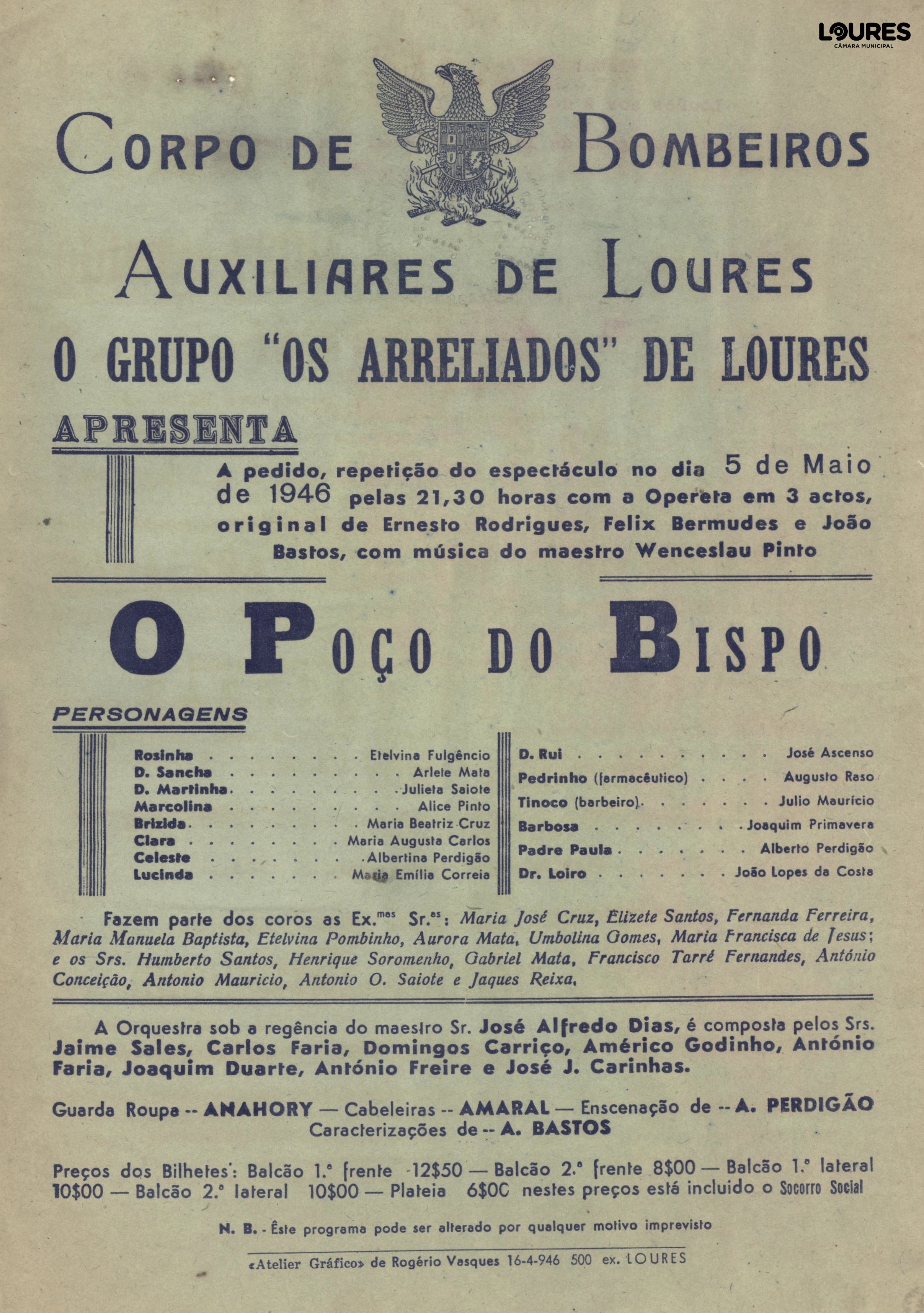 Um cartaz de 1946 a anunciar a apresentação da peça «O Poço do Bispo» nos Bombeiros de Loures, faz-nos regressar à Primeira República e recordar a célebre «Parceria» do teatro popular português, formada por Ernesto Rodrigues (1875-1926), Félix Bermudes (1874-1960) e João Bastos (1883-1957). Entre 1912 e 1926 o trio foi responsável por alguns dos maiores sucessos de teatro ligeiro português. Um vasto número de comédias, operetas e revistas, originais ou adaptadas, da sua autoria, foram postas em cena em vários teatros do país, conquistando o público e marcando uma era de crítica social e política, de criatividade e de inovação.