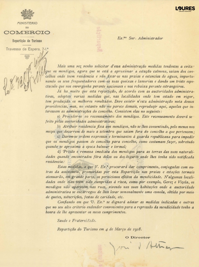 Em 1918, durante a Primeira República, a Repartição de Turismo pediu aos administradores dos concelhos que adotassem medidas para evitar que os mendigos se deslocassem para as praias e «estâncias de águas» durante a «estação calmosa». O objetivo era impedir que os frequentadores desses locais fossem importunados pelas queixas e lamúrias dos pedintes, acautelando «um triste espetáculo» que envergonhava os portugueses e depreciava a imagem do país perante os estrangeiros.