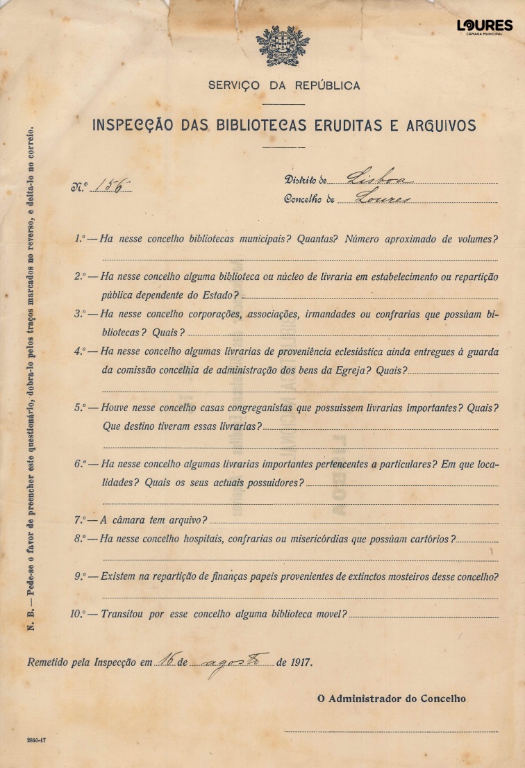 Num apelo à reflexão sobre a importância das bibliotecas na promoção da leitura e no acesso à informação, partilhamos um ofício enviado pela Inspeção das Bibliotecas Eruditas e Arquivos [Biblioteca Nacional] ao administrador do concelho de Loures. O documento incluía um questionário sobre as bibliotecas e livrarias do concelho de Loures.