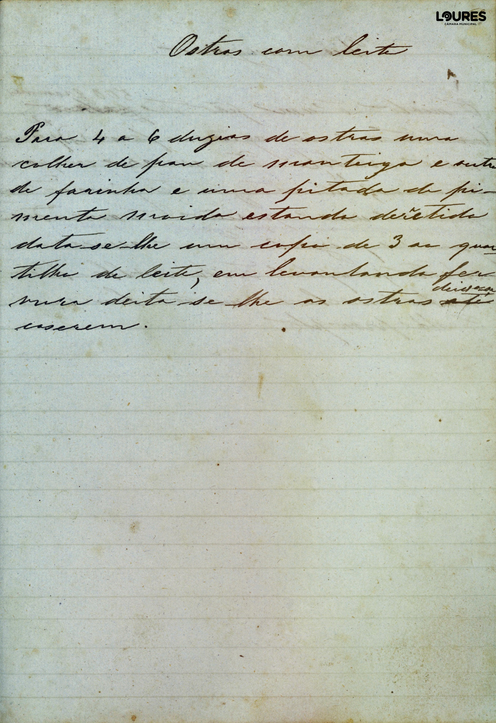 (…) uma colher de pau de manteiga, outra de farinha e uma pitada de pimenta moída derretidas, deita-se-lhe um copo de 3 (…) de leite, em levantando fervura, deitam-se-lhe as ostras e deixa-se cozer].