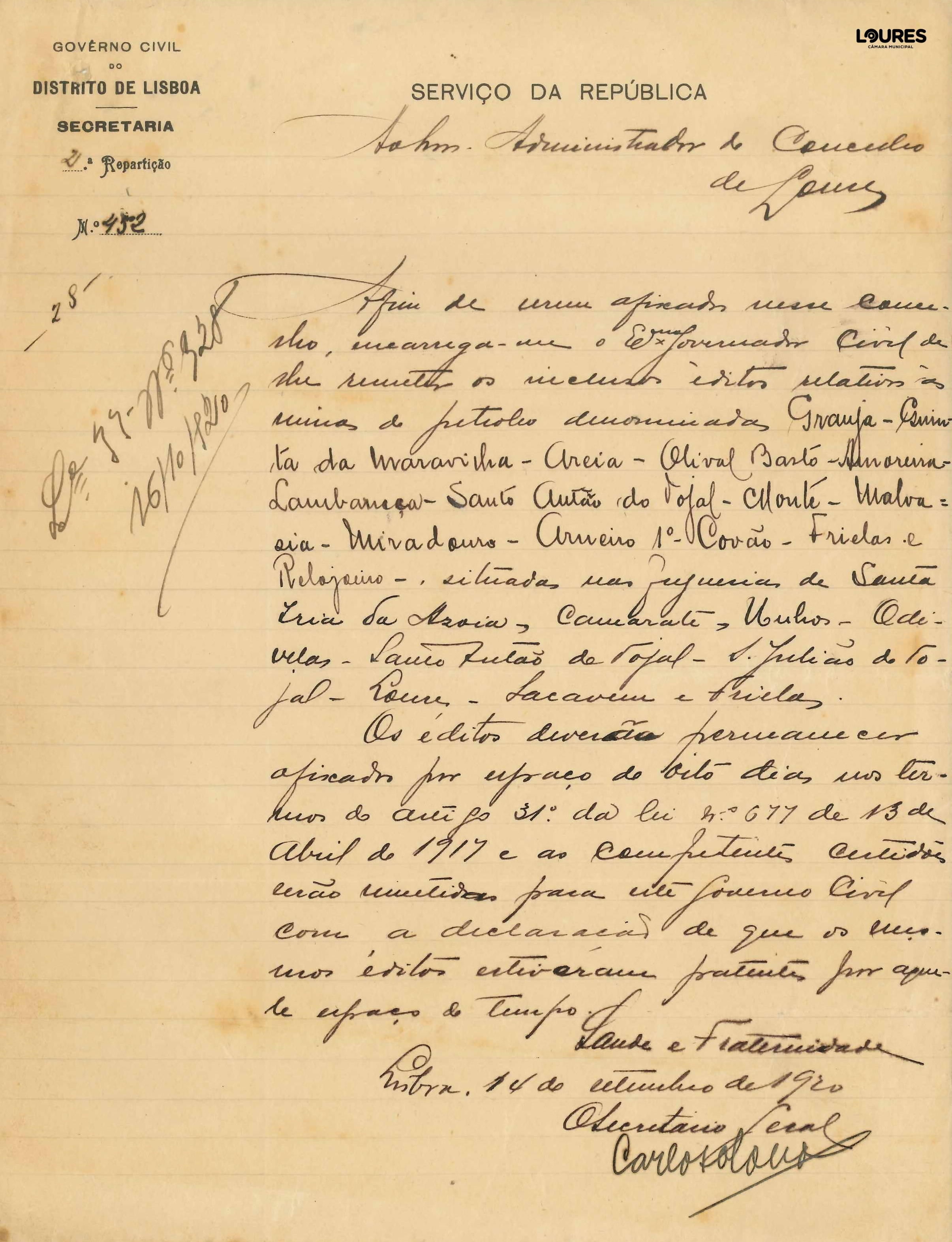 A 14 de [outubro] 1920, o Governo Civil do Distrito de Lisboa enviou um ofício ao administrador do concelho de Loures solicitando a afixação de éditos relativos a diversas minas de petróleo. Estas minas, com nomes como Granja, Quinta da Maravilha, Areia, Olival Basto, Amoreira, [Lambaneça?], Santo Antão do Tojal, Monte, Malvasia, Miradouro, Arneiro 1.º Covão, Frielas e Relojoeiro estavam localizadas em várias freguesias incluindo Santa Iria de Azóia, Camarate, Unhos, Odivelas, Santo Antão do Tojal, São Julião do Tojal, Loures, Sacavém e Frielas.