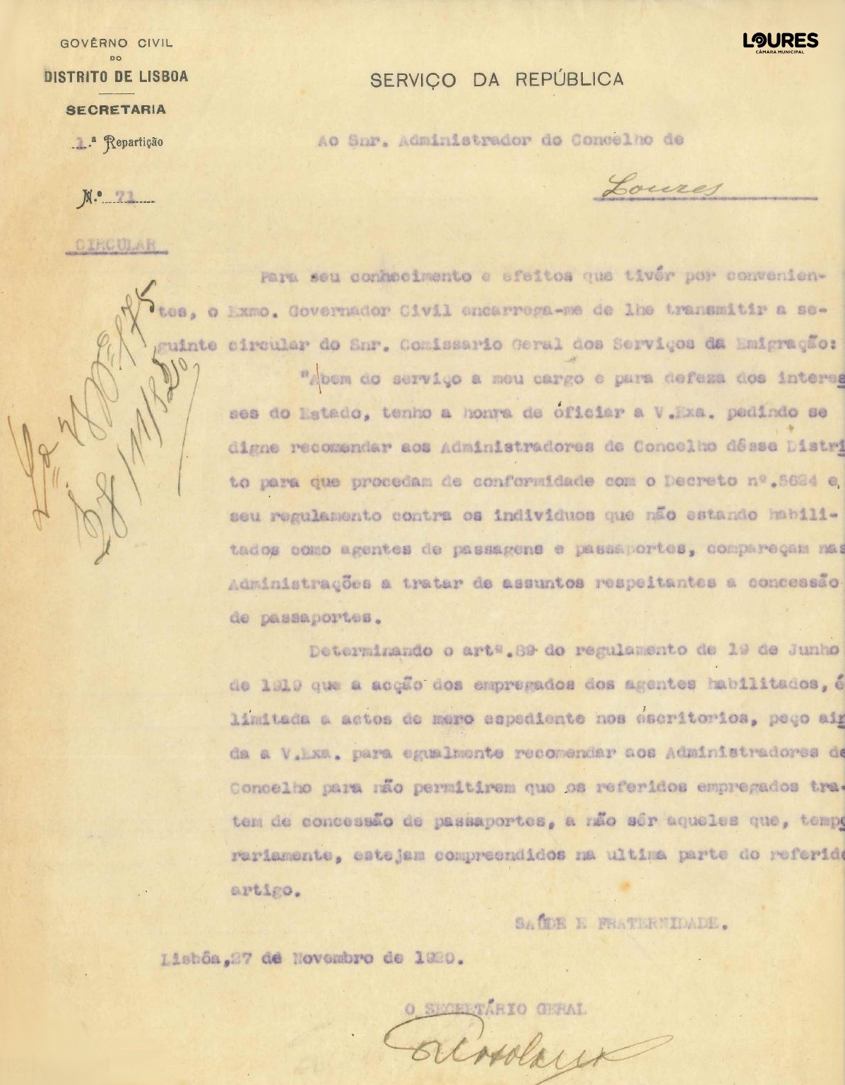 A emigração portuguesa, fenómeno recorrente ao longo da história nacional, assumiu relevância no período imediatamente posterior à Primeira Guerra Mundial. A 27 de novembro de 1920, o Governo Civil do Distrito de Lisboa enviou aos administradores dos concelhos do distrito uma circular do Comissário-Geral dos Serviços de Imigração com indicações relativas à concessão de passaportes. O documento alertava para a necessidade de impedir que indivíduos não habilitados como agentes de passagens e passaportes se apresentassem nas administrações locais para tratar de assuntos relacionados com a emissão de passaportes.
