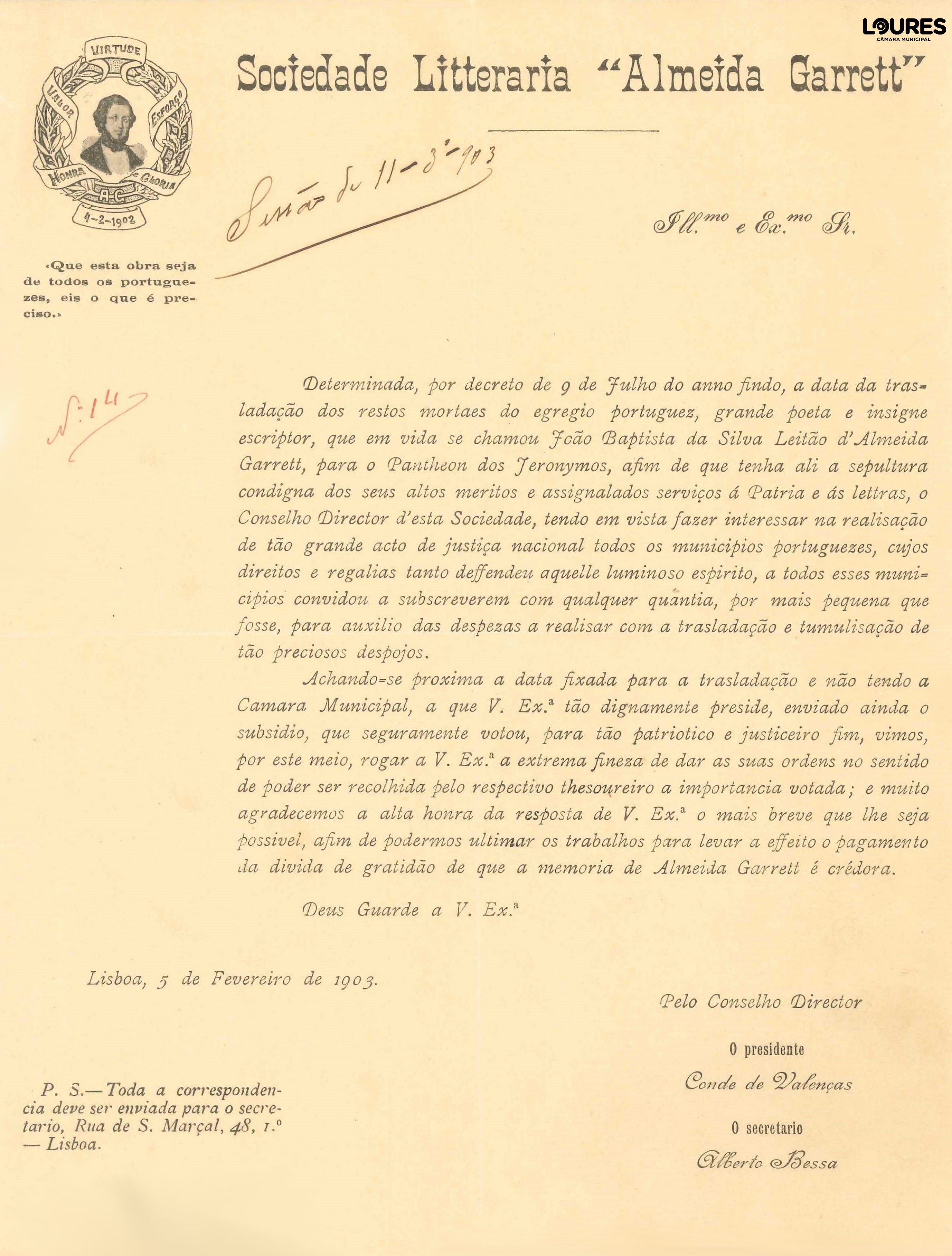 Numa circular emitida a 5 de fevereiro de 1903, que aqui divulgamos, a Sociedade Literária Almeida Garrett solicitava contribuições para a nova sepultura, sublinhando a urgência da iniciativa. Referia que a data prevista para a transferência dos restos mortais do escritor e poeta se aproximava e, não tendo ainda a Câmara Municipal de Loures enviado o subsídio — aparentemente já votado para tão patriótico fim — pedia uma resposta breve.